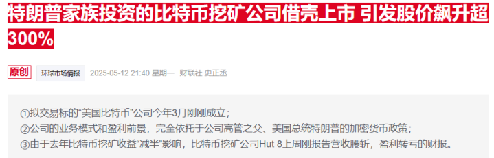 财联社先前报道提到,今年5月时,Hut8官宣AmericanBitcoin将要以全股票置换方式与Gryphon合并时,后者股价单日暴涨173%。